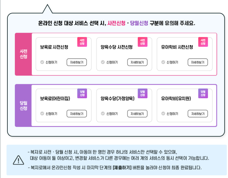 - 보육료, 유아학비, 양육수당 중 중복 지원은 불가합니다.